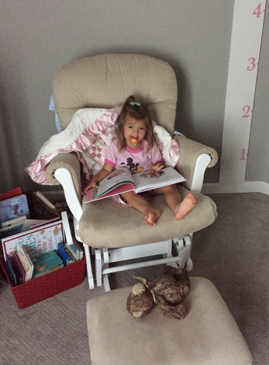 Our bedtime routine is very special, and very strict. Sometimes we start with a tubby time, others we just go straight to Jammies. Then it’s time for a show and some yogurt. The show is always Dora. The kitty one or the choo choo one are favorites. Once the show is over we both say, “time for rest” and head up stairs. Depending on her mood, brushing teeth can either be a fun little game with mommy or an out-and-out battle. After brushing teeth (always with the choo choo toothbrush) we head to Claires room to read a book. I let her pick. Lately it’s been curious George again, but recently it was the Disney princess book or Blankie book. I do love to cuddle and rock her as we read, though the stories are a little tedious! After our story it’s time for bed, and binkie. I feel like a bad mother but Claire still gets binkie when she’s in bed. It is good for both of us right now! Once she is all tucked in with binkie, mr bear, baby lamb and kitty, I snuggle up next to her and sing our goodnight song and talk about the day. At this point I usually don’t want to leave her, she is so sweet. But inevitably she will say, “I’ll check on you. Do laundry.” This means she is ready to zonk out. So I say, “ok I will check on you, I’ll go do my laundry.” A couple ugga muggas, a kiss, and I walk out and close the door. That’s the routine!