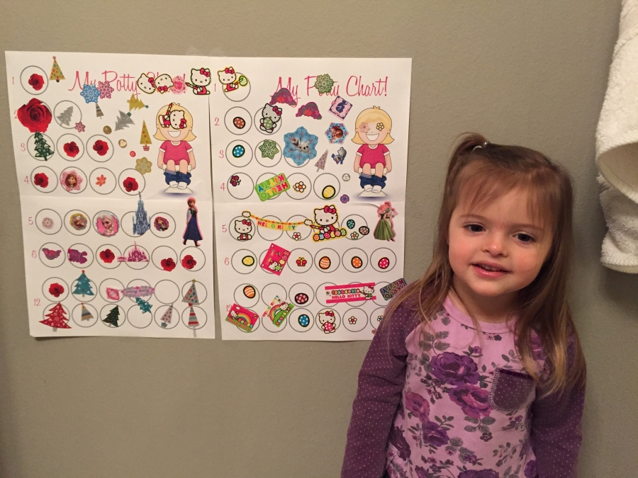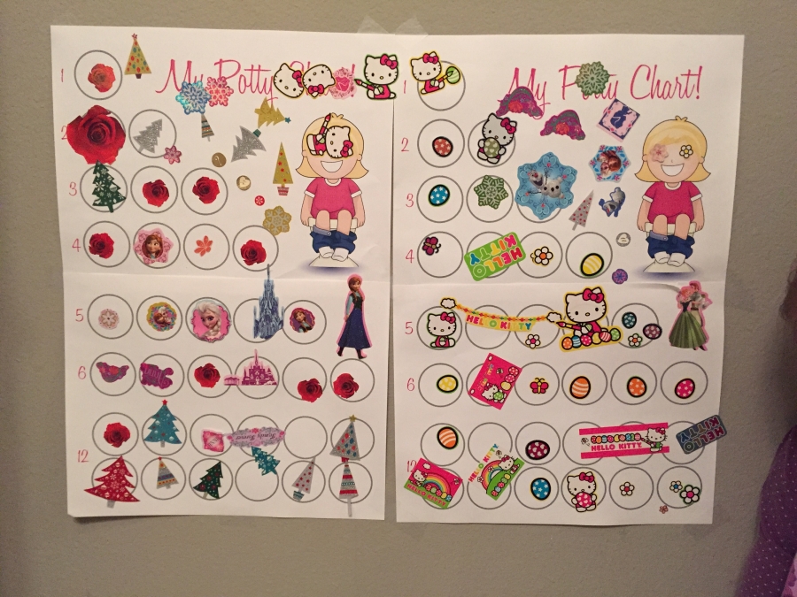 It was such a battle the first few days. I tried everything to make it fun, and visited the bathroom with her every half hour. It was mentally exhausting! She had lots of accidents and for a while it seemed like we were taking two steps forward, one step back. I lost patience with her once and let things degrade to a horrible battle that ended in tears on both sides. But I kept on. The sticker chart began to work, and soon I had to add another chart to the bathroom wall.
